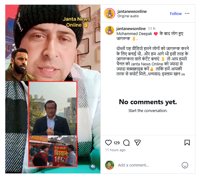 مزید جانچ میں یہ بھی سامنے آیا کہ jantanewsonline کے انسٹاگرام چینل پر بھی ایک ویڈیو پوسٹ کی گئی ہے، جس میں بتایا گیا ہے کہ اس اسکرپٹڈ ویڈیو میں جو شخص بریانی والے کا نام پوچھنے آتا ہے، اس کا نام یوسف ہے۔ اس ویڈیو میں بھی کانٹینٹ کریئیٹر کی جانب سے واضح کیا گیا ہے کہ یہ ویڈیو بیداری پھیلانے کے مقصد سے بنایا گیا تھا۔