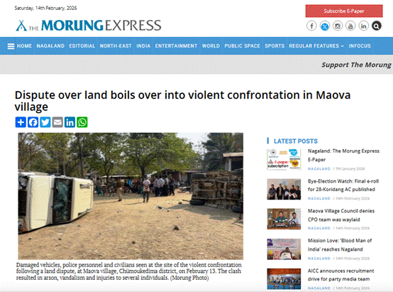 اس کے علاوہ ہمیں اخبار The Morung Express کی رپورٹ بھی ملی۔ اس رپورٹ میں 13 فروری 2026 کو موآوا گاؤں میں زمین کے تنازعے پر ہونے والے پرتشدد تصادم کی تصدیق کی گئی ہے۔ کہیں بھی بھارتی فوج کے خلاف آزادی کے مطالبے پر بڑے پیمانے کے احتجاج کا کوئی ذکر نہیں کیا گیا۔