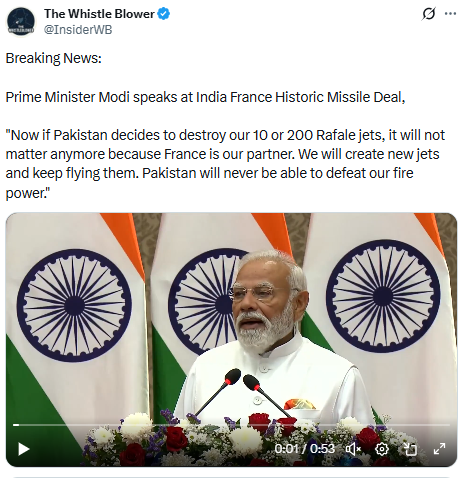 “بریکنگ نیوز: بھارت-فرانس تاریخی میزائل ڈیل پر وزیر اعظم مودی نے کہا، ‘اب اگر پاکستان ہمارے 10 یا 200 رافیل جیٹ تباہ کرنے کا فیصلہ کرتا ہے تو اس سے کوئی فرق نہیں پڑے گا کیونکہ فرانس ہمارا پارٹنر ہے۔ ہم نئے جیٹ بنائیں گے اور انہیں اڑاتے رہیں گے۔ پاکستان ہماری فائر پاور کو کبھی شکست نہیں دے پائے گا۔’”