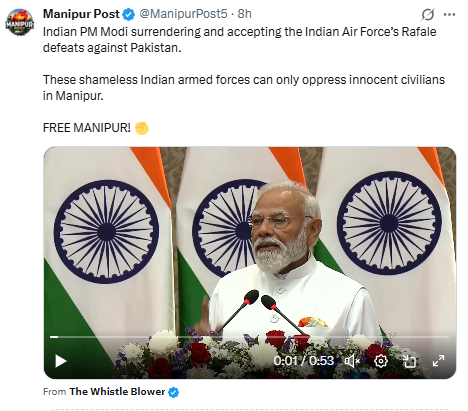 بھارت-فرانس سمٹ کے دوران وزیر اعظم Narendra Modi اور فرانس کے صدر Emmanuel Macron کی موجودگی میں دونوں ممالک کے درمیان کئی اہم معاہدوں پر دستخط ہوئے، جن میں دفاع، ٹیکنالوجی اور صحت جیسے بڑے شعبے شامل ہیں۔ اس دوران سوشل میڈیا پر پاکستانی پروپیگنڈا اکاؤنٹس نے وزیر اعظم مودی کا اسی سمٹ سے منسوب ایک بیان شیئر کیا، جس میں انہیں مبینہ طور پر پاکستان کی جانب سے رافیل جیٹ مار گرائے جانے کی بات کرتے ہوئے سنا جا سکتا ہے۔ تاہم وزیر اعظم مودی نے ایسا کوئی بیان نہیں دیا، اور ان کا وائرل بیان ڈیجیٹلی ایڈیٹ کیا گیا ہے۔