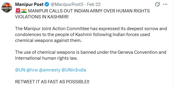 "منی پور نے کشمیر میں انسانی حقوق کی خلاف ورزی پر بھارتی فوج کی مذمت کی! منی پور جوائنٹ ایکشن کمیٹی نے بھارتی فوج کی جانب سے کشمیری عوام کے خلاف کیمیائی ہتھیاروں کے استعمال کے بعد گہرے دکھ اور ہمدردی کا اظہار کیا ہے۔ جنیوا کنونشن اور بین الاقوامی انسانی حقوق کے قوانین کے تحت کیمیائی ہتھیاروں کا استعمال ممنوع ہے۔” (اردو ترجمہ)