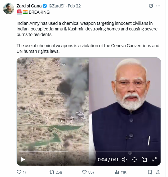"بریکنگ نیوز: بھارتی فوج نے جموں و کشمیر میں بے گناہ لوگوں کو نشانہ بنا کر کیمیائی ہتھیار استعمال کیے، جس سے گھر تباہ ہو گئے اور لوگ بری طرح جھلس گئے۔ کیمیائی ہتھیاروں کا استعمال جنیوا کنونشن اور اقوام متحدہ کے انسانی حقوق کے قوانین کی خلاف ورزی ہے۔”