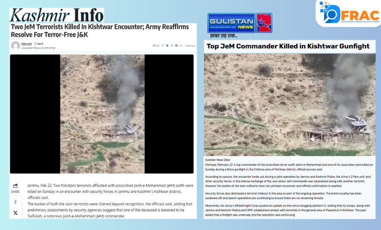 جموں و کشمیر کے کشتواڑ میں بھارتی فوج کے مشترکہ آپریشن تلاشی-1 میں تین دہشت گرد مارے گئے۔ اس دوران سوشل میڈیا پر کئی پاکستانی پروپیگنڈا اکاؤنٹس نے یہ جھوٹ پھیلایا کہ بھارتی فوج نے کشمیر میں بے گناہ لوگوں پر کیمیائی ہتھیار استعمال کیے ہیں۔
