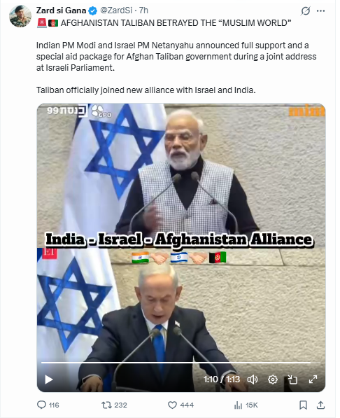 "افغانستان کی طالبان نے ’مسلم دنیا‘ کو دھوکہ دیا۔ بھارتی وزیرِاعظم مودی اور اسرائیلی وزیرِاعظم نیتن یاہو نے اسرائیلی پارلیمنٹ میں مشترکہ خطاب کے دوران افغان طالبان حکومت کے لیے مکمل حمایت اور ایک خصوصی امدادی پیکیج کا اعلان کیا۔ طالبان باضابطہ طور پر اسرائیل اور بھارت کے ساتھ نئے اتحاد میں شامل ہو گئے ہیں۔”