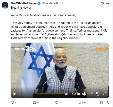 "بریکنگ نیوز: وزیرِاعظم مودی نے اسرائیلی کنیسٹ سے خطاب کرتے ہوئے کہا، ’مجھے یہ بتاتے ہوئے بہت خوشی ہو رہی ہے کہ بھارت اور اسرائیل کے درمیان 8.6 بلین ڈالر کے فوجی معاہدے کے علاوہ، ہمارے پاس افغانستان کی تعمیرِ نو کے لیے ایک خصوصی امدادی پیکیج بھی ہوگا۔ ان کی مشکلات ختم ہونی چاہئیں۔ بھارت اور اسرائیل یہ یقینی بنائیں گے کہ افغانستان کو وہ سیکیورٹی ملے جس کی اسے اپنے پڑوس میں دہشت گردی کے مراکز سے خود کو محفوظ رکھنے کے لیے ضرورت ہے۔‘”