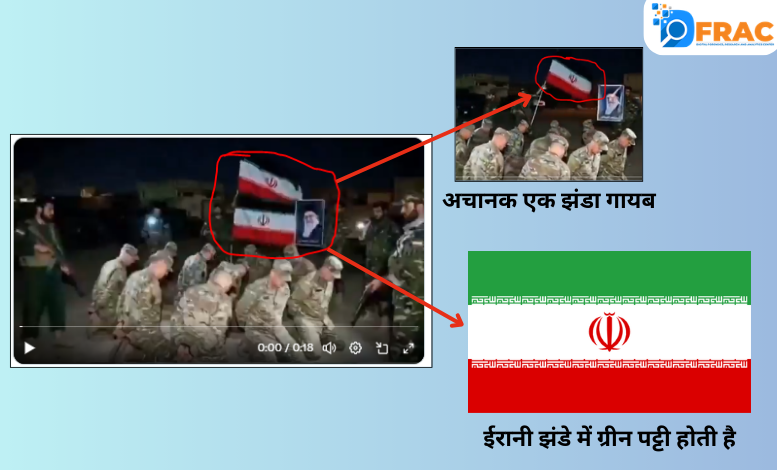 DFRAC کی ٹیم نے تحقیقات میں پایا کہ وائرل ویڈیو حقیقی نہیں بلکہ اے آئی سے تیار کردہ ہے۔ جانچ کے دوران ہمیں ویڈیو میں کئی تضادات نظر آئے۔ مثال کے طور پر ویڈیو کے آغاز میں دو ایرانی جھنڈے نظر آتے ہیں، لیکن اگلے ہی لمحے ایک جھنڈا اچانک غائب ہو جاتا ہے۔ ایک اور خامی یہ ہے کہ ویڈیو میں دکھائے گئے ایرانی جھنڈے کے اوپر سبز پٹی موجود نہیں ہے، جبکہ ایران کے جھنڈے میں تین رنگ ہوتے ہیں: اوپر سبز، درمیان میں سفید اور نیچے سرخ۔