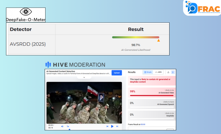 مزید تحقیقات کے لیے ہم نے وائرل ویڈیو کو اے آئی ڈیٹیکشن ٹولز Hive Moderation اور Deepfake-O-Meter کے ذریعے جانچا۔ Hive Moderation کے مطابق یہ ویڈیو 99 فیصد اے آئی سے تیار کردہ ہے۔ جبکہ Deepfake-O-Meter کے جدید ٹول AVSRDD (2025) کے ذریعے کی گئی جانچ میں نتیجہ سامنے آیا کہ اس ویڈیو کے 98.7 فیصد اے آئی سے تیار ہونے کے امکانات ہیں۔