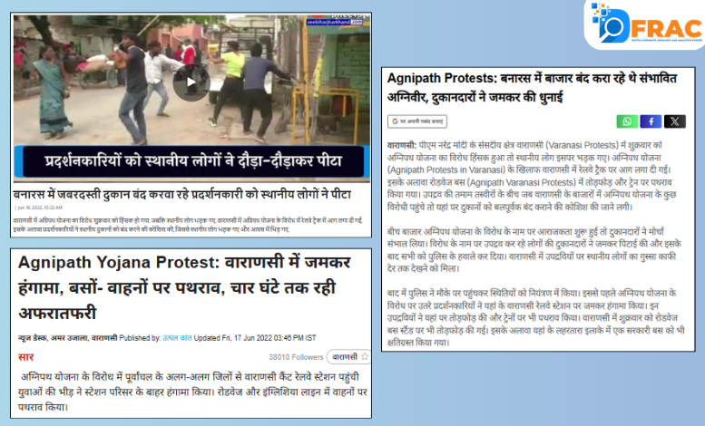 اس واقعے کے بارے میں گوگل پر کچھ کی ورڈز سرچ کرنے پر ہمیں امر اجالا، زی بہار-جھارکھنڈ اور نو بھارت ٹائمز کی رپورٹس بھی ملیں، جن میں وائرل ویڈیو کے ساتھ تفصیلی رپورٹ میں اسے وارانسی کا بتایا گیا ہے۔ نو بھارت ٹائمز کی رپورٹ میں بتایا گیا ہے: ‘اگنی پتھ یوجنا کے خلاف کے نام پر افراتفری شروع ہوئی تو دکانداروں نے محاذ سنبھال لیا۔ احتجاج کے نام پر ہنگامہ کر رہے لوگوں کی دکانداروں نے جم کر پٹائی کی اور اس کے بعد سبھی کو پولیس کے حوالے کر دیا۔ وارانسی میں شرپسندوں پر مقامی لوگوں کا غصہ کافی دیر تک دیکھنے کو ملا۔’