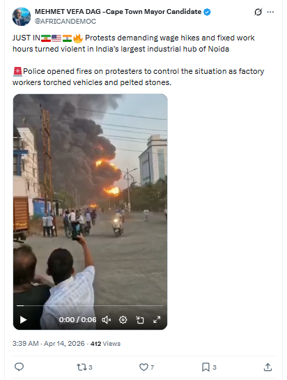 ایک دیگر یوزر نے لکھا، ‘بھارت کے سب سے بڑے صنعتی مرکز نوئیڈا میں تنخواہ میں اضافہ اور کام کے مقررہ اوقات کی مانگ کو لے کر ہونے والے مظاہرے پرتشدد ہو گئے۔ صورتحال کو قابو میں کرنے کے لیے پولیس نے مظاہرین پر گولیاں چلائیں، کیونکہ فیکٹری ملازمین نے گاڑیوں کو آگ لگا دی اور پتھراؤ کیا۔’