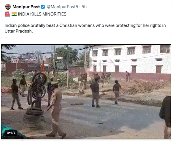 سوشل سائٹ ایکس (سابق ٹوئٹر) پر ویریفائیڈ یوزر منی پور پوسٹ نے وائرل ویڈیو شیئر کرتے ہوئے لکھا کہ بھارت اقلیتوں کو قتل کرتا ہے، اتر پردیش میں اپنے حقوق کے لیے احتجاج کر رہی ایک عیسائی خاتون کو بھارتی پولیس نے بے رحمی سے پیٹا۔