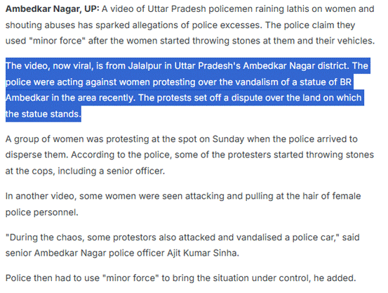 اس کے علاوہ ہمیں اس واقعے سے متعلق این ڈی ٹی وی کی رپورٹ بھی ملی۔ رپورٹ کے مطابق یہ واقعہ اتر پردیش کے جلال پور کا ہے۔ یہاں کچھ خواتین علاقے میں بی آر امبیڈکر کے مجسمے کو توڑے جانے کے خلاف احتجاج کر رہی تھیں۔ تنازع اس زمین کو لے کر تھا جہاں مجسمہ نصب کیا گیا تھا۔