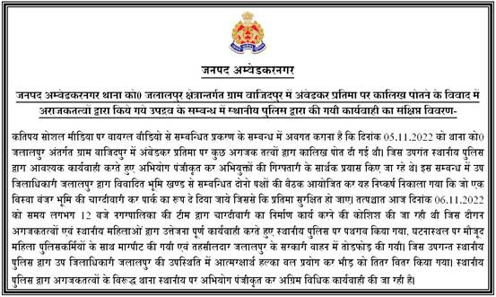 اس کے علاوہ اس واقعے سے متعلق پولیس کا پریس نوٹ بھی ملا۔ پریس نوٹ کے مطابق 05 نومبر 2022 کو تھانہ جلال پور علاقے کے گاؤں واجدپور میں بی آر امبیڈکر کے مجسمے پر کچھ شرپسند عناصر نے کالک پوت دی تھی۔ اس کے بعد پولیس نے مقدمہ درج کر کے کارروائی شروع کی۔
